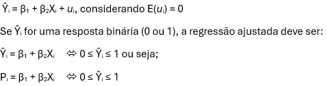 A equação acima representa o modelo de probabilidade linear (MPL) e corresponde a uma linha reta. Neste caso, ninguém pode garantir que os resultados (Pi ou Yi) respeitarão os limites [0,1]. Dependendo do valor de Xi, Ŷi pode ser negativo ou maior que 1, a menos que as seguintes restrições sejam aplicadas: