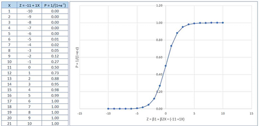 Observe na figura abaixo que o logit é uma transformação linear de X e a função de probabilidade se transforma em uma curva sigmoide de -∞ a +∞ com os limites [0,1].